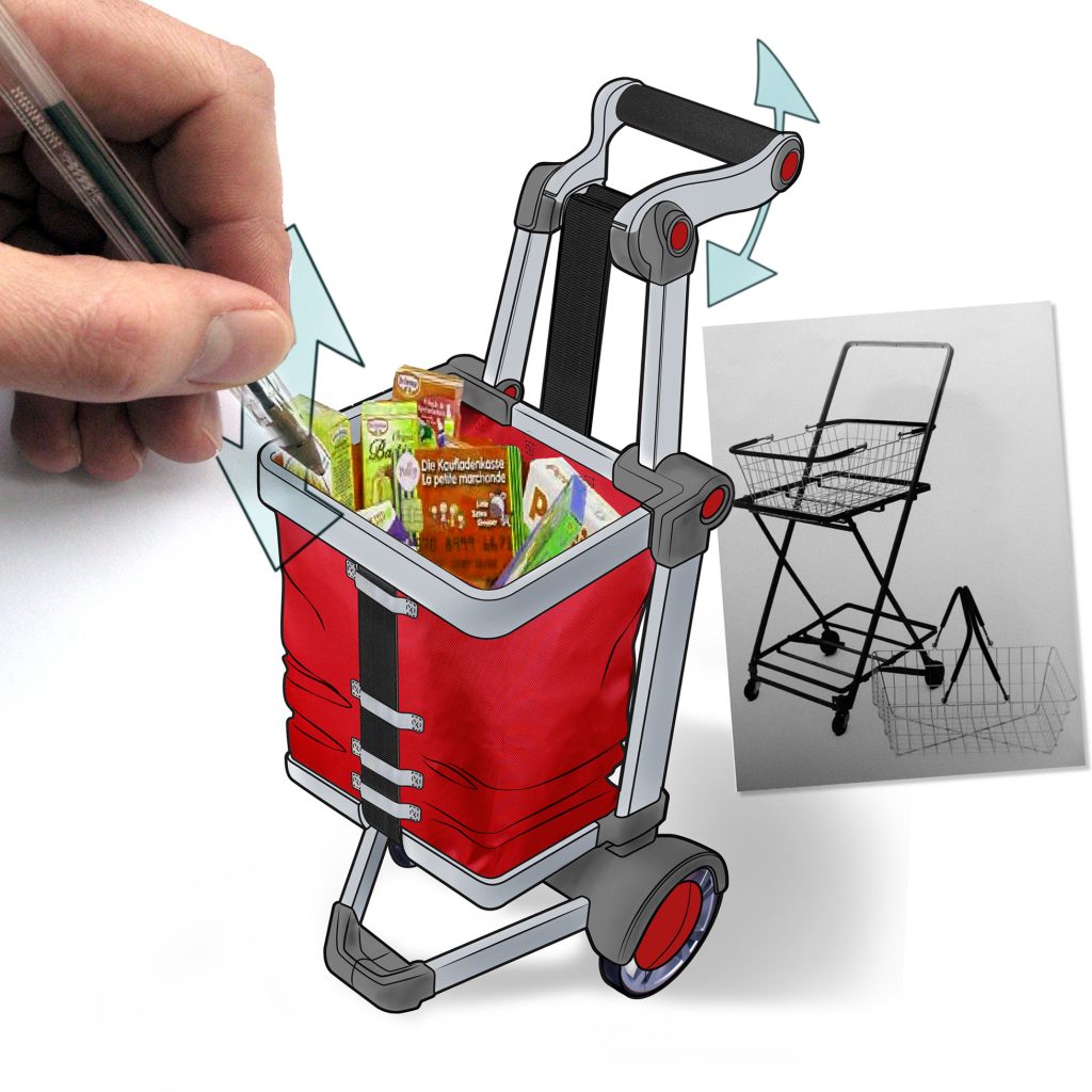 La douleur dorsale ressentie, au moment de récupérer les derniers objets tout au fond du chariot, ne vous est surement pas étrangère. Pourquoi ne pas faire venir les articles à nous ? Inspiré par le système des sangles à cliquet, nous imaginons une poignée crantée, qui ferait monter le fond du chariot… Vivement le marché!